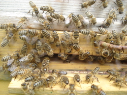 Wow. Hier zieht wohl gerade ein fremder Schwarm ein und die Bienen, die mich bei meinen Jätearbeiten vor zwei Stunden "belästigt" haben, waren die Spurbienen, die nach einer neuen Behausung gesucht haben. Die leeren Waben wurden offenbar für gut befunden, denn inzwischen krabbeln bereits die ersten Bienen ins Innere.